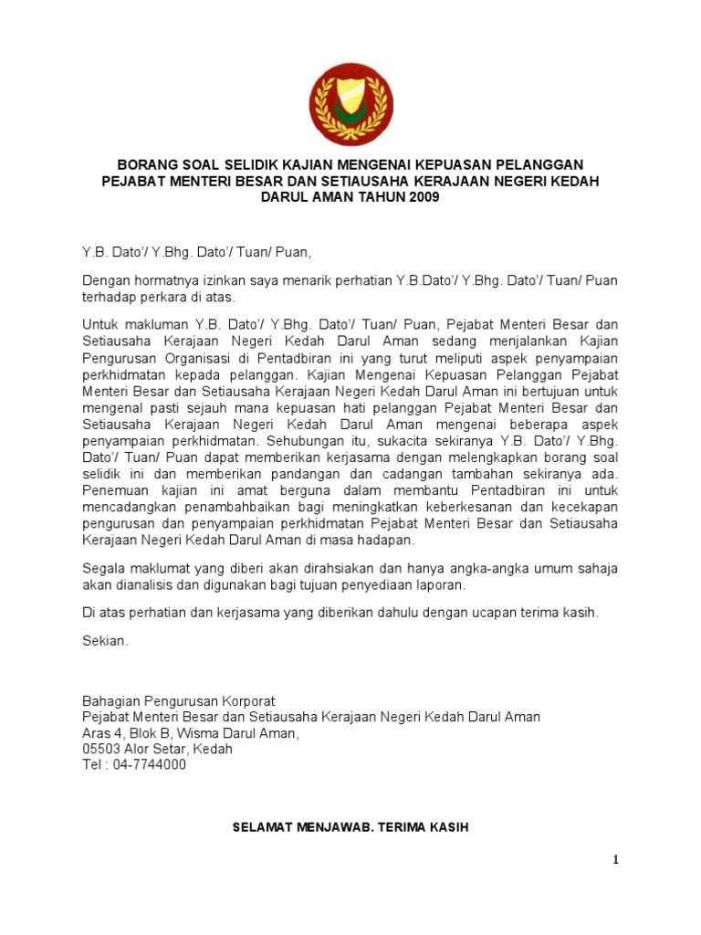 Kepuasan pelanggan adalah selisih antara harapan, persepsi serta pengorbanan pembeli maupun pelanggan terhadap kenyataan hasil / produk yang pengertian kepuasan pelanggan menurut kotler dalam rambat lupiyoadi dan a. Related posts to contoh borang soal selidik kepuasan kerja guru. Pejabat menteri besar dan setiausaha kerajaan negeri kedah. Sila isikan skala bagi soalan maklumbalas pelanggan. Borang kaji selidik kepuasan pelanggan c.