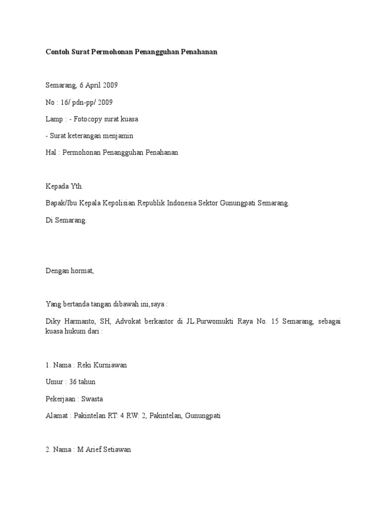 Dengan ini mengajukan permohonan kepada bapak kapolres solo kiranya kami dapat diberikan kebijaksanaan untuk diberi penangguhan penahanan atas rico linda yang mana saat ini. Pidum kejaksaan negeri surabaya di surabaya agar berkenan mengabulkan permohonan penangguhan penahanan terhadap suami saya tersebut atau melakukan pengalihan jenis tahanan dari tahanan. Berikut ini adalah contoh surat penangguhan pembayaran untuk mahasiswa yang belum ada dana untuk membayar kuliah. Contoh surat permohonan penangguhan penahanan. Permohonan penangguhan upah minimum tahun 2020.