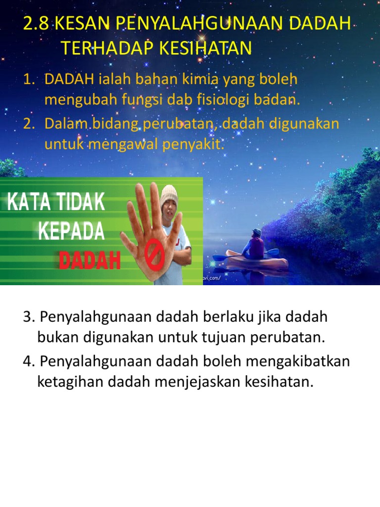 We are a sharing community. 3ejala penyalahgunaan dadah bukan hanya mendatangkan kesan(kesan negatif terhadap diri tetapi ia juga mampu menyebarkan kesan(kesan negatif tersebut kepada masyarakat. Semester 1 2015 sains a04 100 kesan penyalahgunaan dadah terhadap koordinasi badan dan kesihatan disediakan oleh: Masalah yang berlaku dalam setiap lapisan masyarakat merupakan penyalahgunaan dadah. Penyalahgunaan dadah memberi kesan buruk dari segi psikologi penagih dan masyarakat sekeliling , ekonomi malah keselamatan masyarakat yang berbilang bangsa. Please copy and paste this embed script to where you want to embed. So please help us by uploading 1 new document or like us to download Penyalahgunaan dadah kini merangkumi jenis dadah bukan sintetik (seperti heroin, morfin, candu dan ganja) dan jenis sintetik (seperti syabu, pil psikotropik, ecstasy dan amphetamine). Walaupun kesan kokain biasanya berlaku, kesannya terhadap janin boleh berlangsung seumur hidup. Bahan kimia yang boleh mengubah fungsi dan fisiologi badan. Dalam pergantungan fisiologi, ia menjadikan pemikiran, emosi dan. Tidak memberi kesan terhadap tingkah laku. Sebelum memabahas lebih jauh tentang apa itu kesan dan pesan untuk sekolah, tak ada.